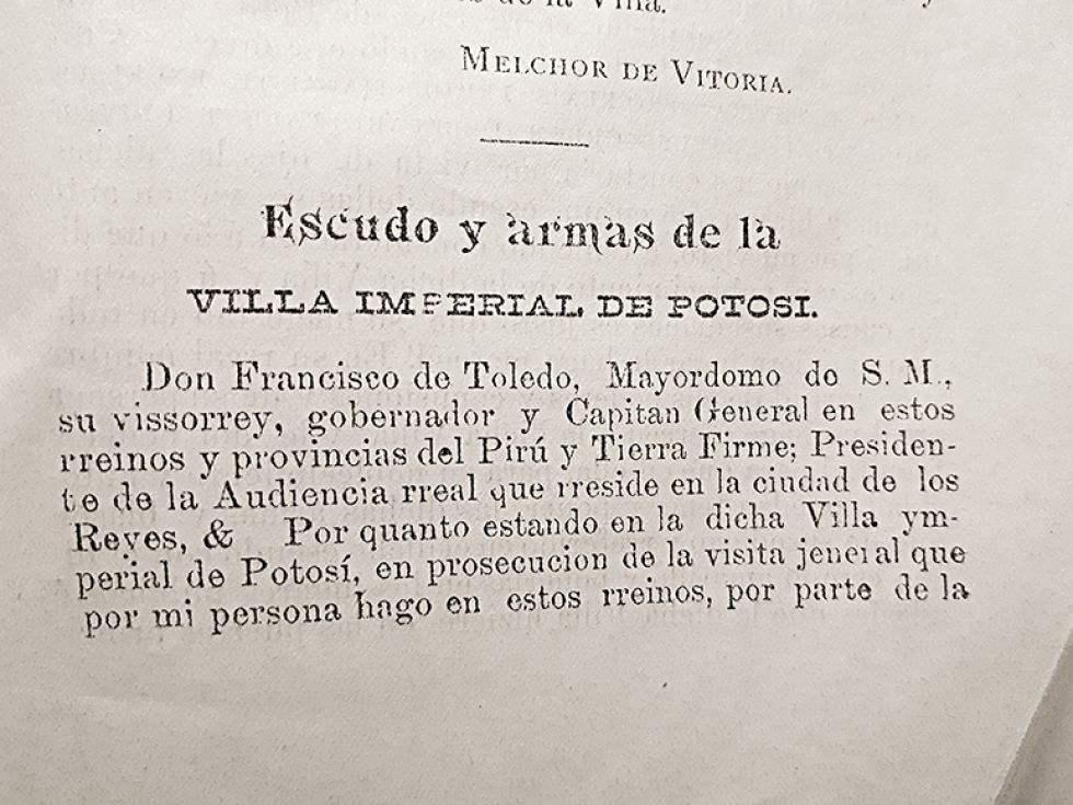 “Se conoce que el año 1892, los potosinos nos enteramos que existe un ESCUDO DE ARMAS. Fue a través del libro MONOGRAFÍA DEL DEPARTAMENTO DE POTOSÍ, publicado por el Centro de Estudios de Potosí, siendo su Presidente el Dr. Modesto Omiste, publica una Provisión Real dada en Arequipa el 2-agosto-1575 por el Virrey don Francisco de Toledo, donde se transcribe el documento en su totalidad sobre la concesión de un ESCUDO A LA VILLA IMPERIAL DE POTOSÍ. Lamentablemente sin mencionar la fuente o el origen del manuscrito”, escribió José Antonio Fuertes en su blog de internet denominado Potosy Cvltvral.