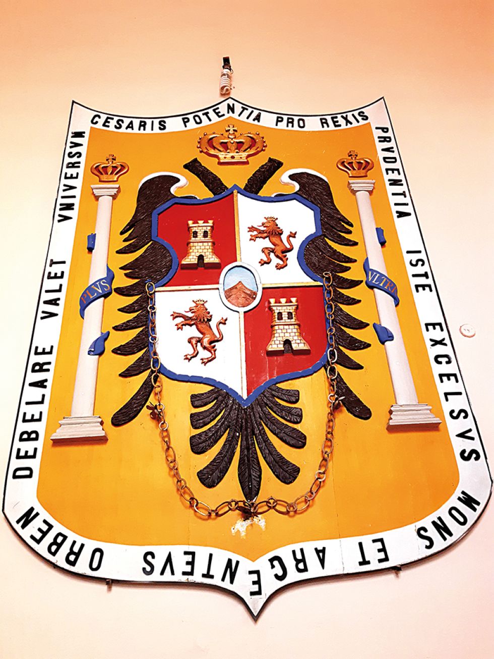 “Con el poder del César - por la prudencia del Rey - este excelso monte argento – dominar alcanza al universo”.