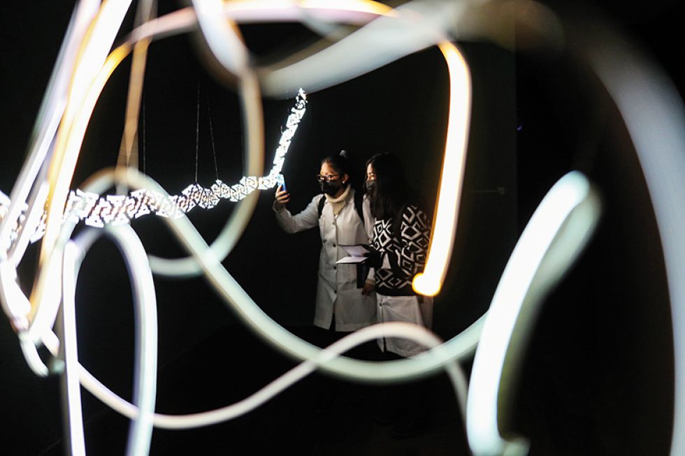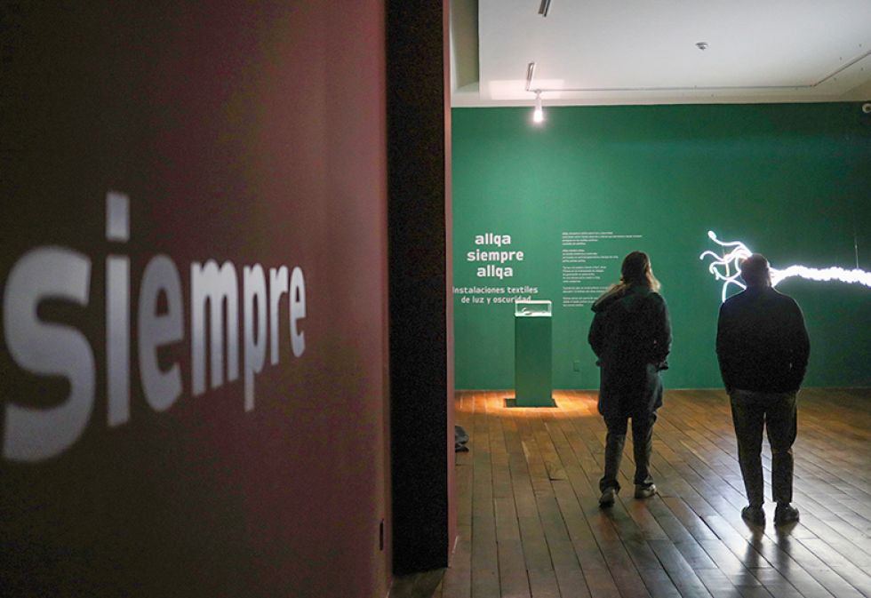 La tecnología ancestral y contemporánea se mezclan en la exposición "Allqa siempre allqa" en la que se utilizan tejidos andinos, luces led y la oscuridad como la base central de tres instalaciones para mostrar la "energía" que fluye a través de los textiles.
