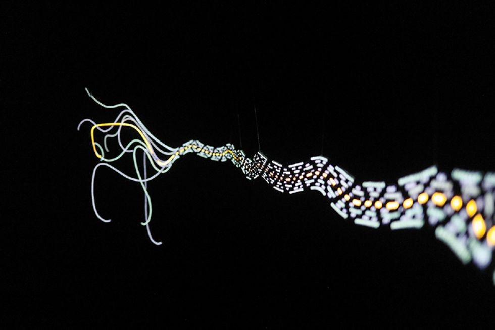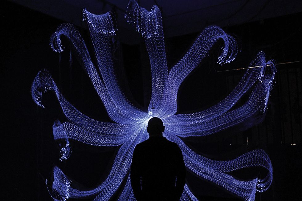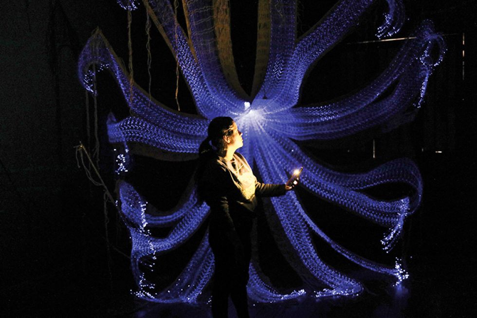 Por último presenta "Portal" una instalación de tres metros en la que teje la fibra óptica con el yute que se mezcla con el uso de luces y que muchos visitantes asemejan a una flor o a una medusa.