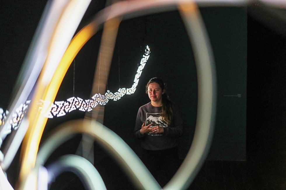 La primera obra, denominada "Tisnu", es una tira tejida que se usa en la cintura, que usualmente son las primeras creaciones de las niñas cuando aprenden a realizar los textiles, que Berduccy tejió con luces led y fibras, que por su tamaño llama la atención de los visitantes.