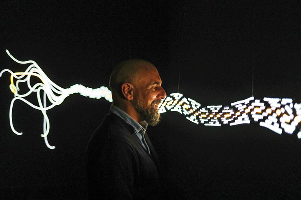 La muestra está en el Centro Cultural de España en La Paz y los visitantes ingresan a una sala oscura para observar las tres instalaciones que están hechas de materiales como luces led, fibra óptica, ropa reciclada, yute y fibras de mantas de las emblemáticas cholitas, las mujeres aimaras.
