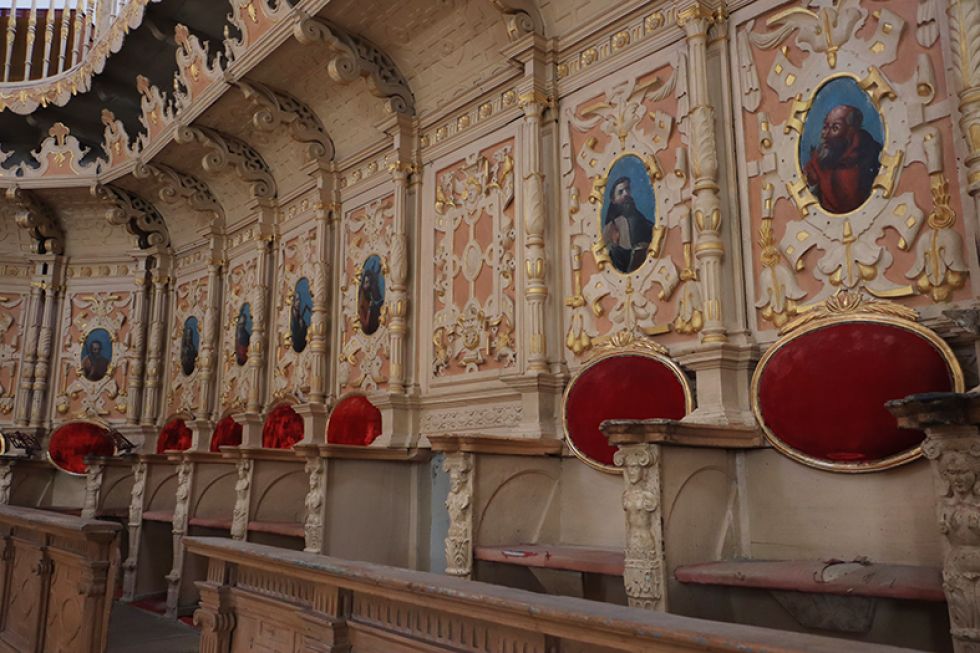 Lo interrumpiría el maestro carpintero Alonso Román para explicar cómo la sillería fue separada por pilastras de orden jónico y como armó los motivos geométricos en los espaldares.