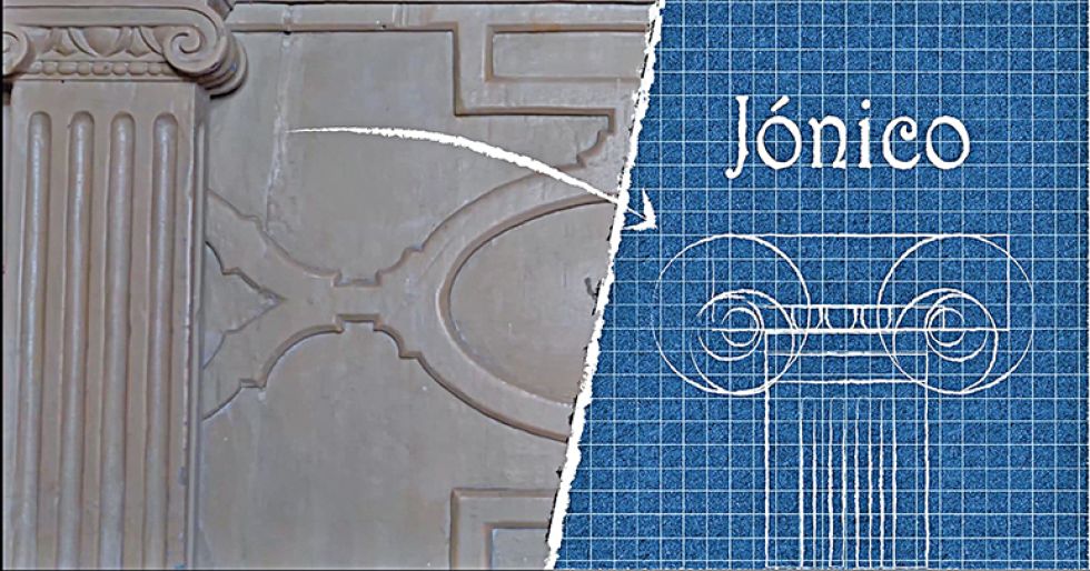 Explicaría que se tomó la libertad de colocar un friso de triglifos y metopas florales encima de los capiteles, inspirados en el orden dórico, para realzar la dignidad de los ocupantes.