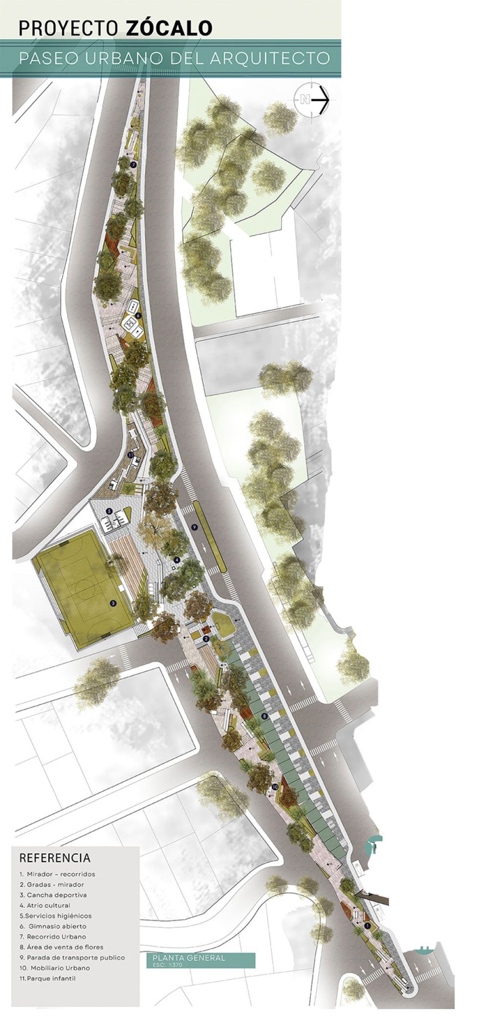 El proyecto ganador conjuga varios usos en el mismo espacio como miradores, recuperación de las gradas, servicios higiénicos, recorridos urbano, mobiliario, juegos infantiles, atrio cultural, cancha y espacios multifuncionales al aire libre para la organización barrial.