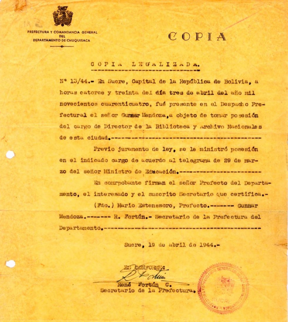 Mediante Memorándum Nº 414/44, de 31 de marzo de 1944, de la Prefectura y Comandancia General del Departamento de Chuquisaca, firmado por el Prefecto Mario Estenssoro, dirigida a Gunnar Mendoza, le hace conocer el tenor del telegrama recibido del Ministerio de Educación, para que le posesione en el cargo de Director de la Biblioteca y el Archivo Nacionales. Efectivamente, en la fecha señalada, Gunnar Mendoza fue posesionado en el despacho del prefecto, el día lunes 3 de abril, como evidencia el Acta Nº 13/44 (Copia legalizada. Sucre, 19 de abril de 1944. Es conforme René Fortún C., Secretario Prefectura): “En Sucre, Capital de la República de Bolivia, a horas catorce y treinta del día tres de abril del año mil novecientos cuarenticuatro, fue presente en el Despacho Prefectural el señor Gunnar Mendoza, a objeto de tomar posesión del cargo de Director de la Biblioteca y Archivo Nacionales de esta ciudad.--- Previo juramento de ley, se le ministro posesión en el indicado cargo de acuerdo al telegrama de 19 de marzo del señor Ministro de Educación.--- En comprobante firman el señor Prefecto del Departamento, el interesado y el suscrito Secretario que certifica.--- (Fdo.) Mario Estenssoro, Prefecto.--- Gunnar Mendoza.--- R. Fortún.--- Secretario de la Prefectura del Departamento.---”