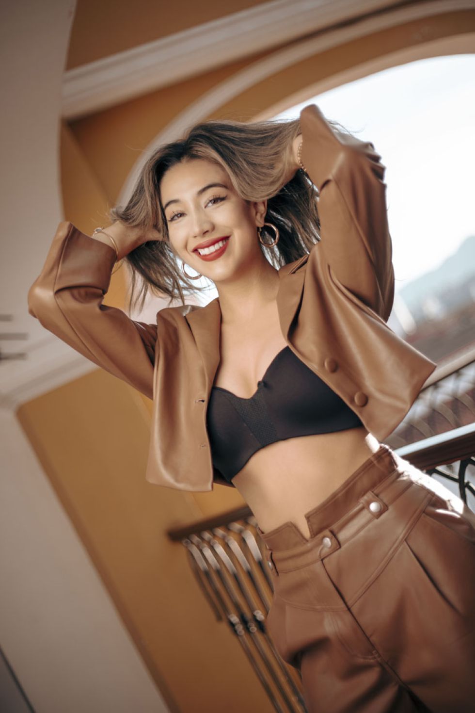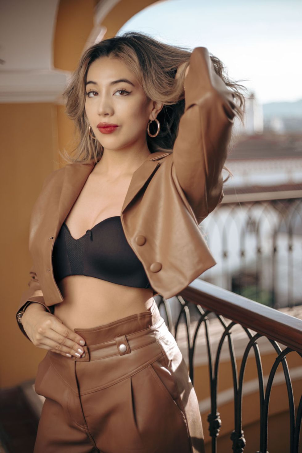 Presenta las nuevas tendencias para esta temporada que se viene Otoño - Invierno 2024. Los materiales son parte de la moda, como el conjunto de cuero vinil / vinil piel, con saco crop y pantalón con pinzas, high waisted.