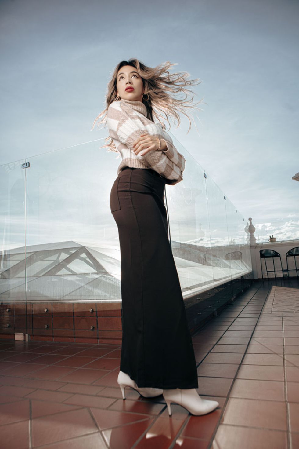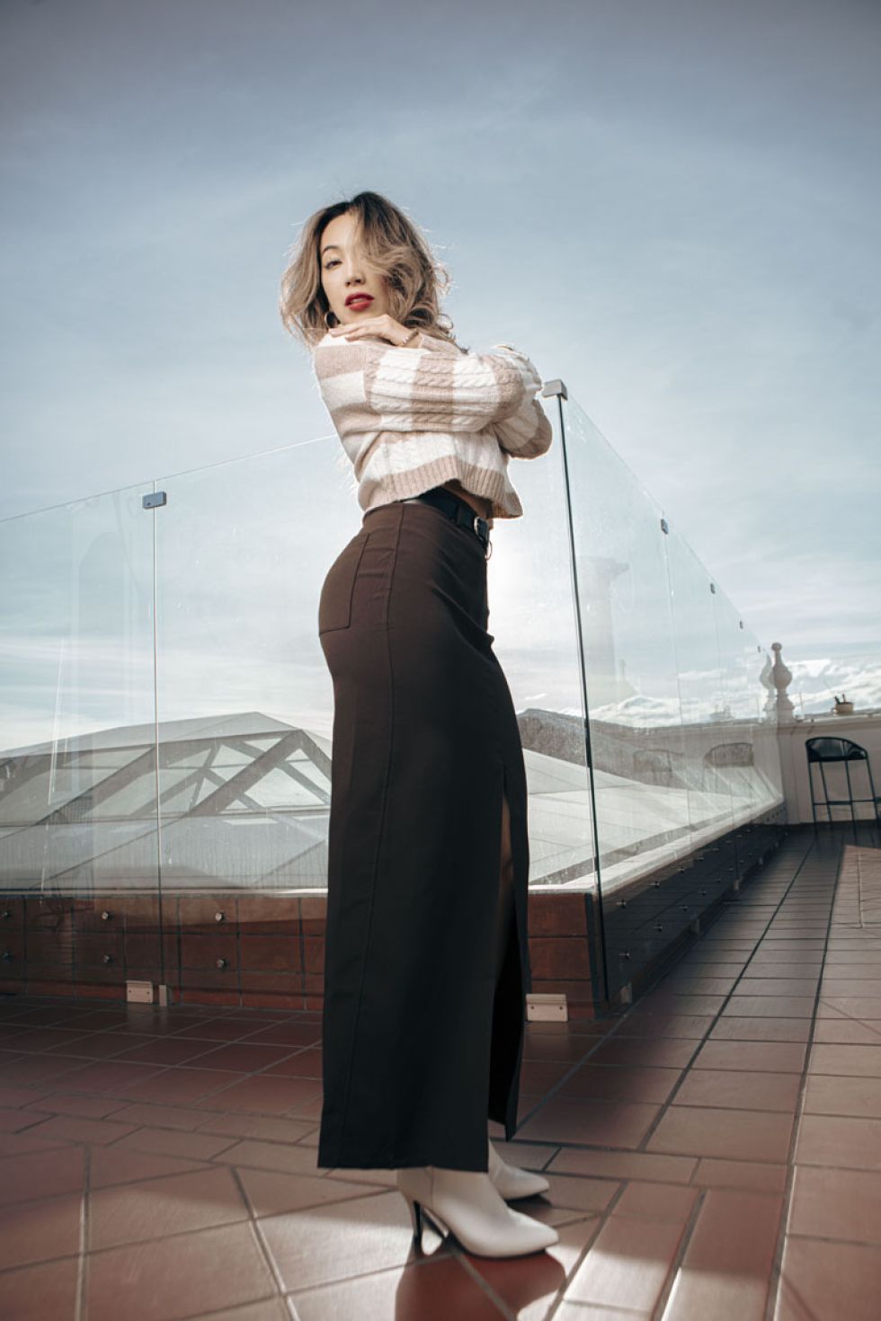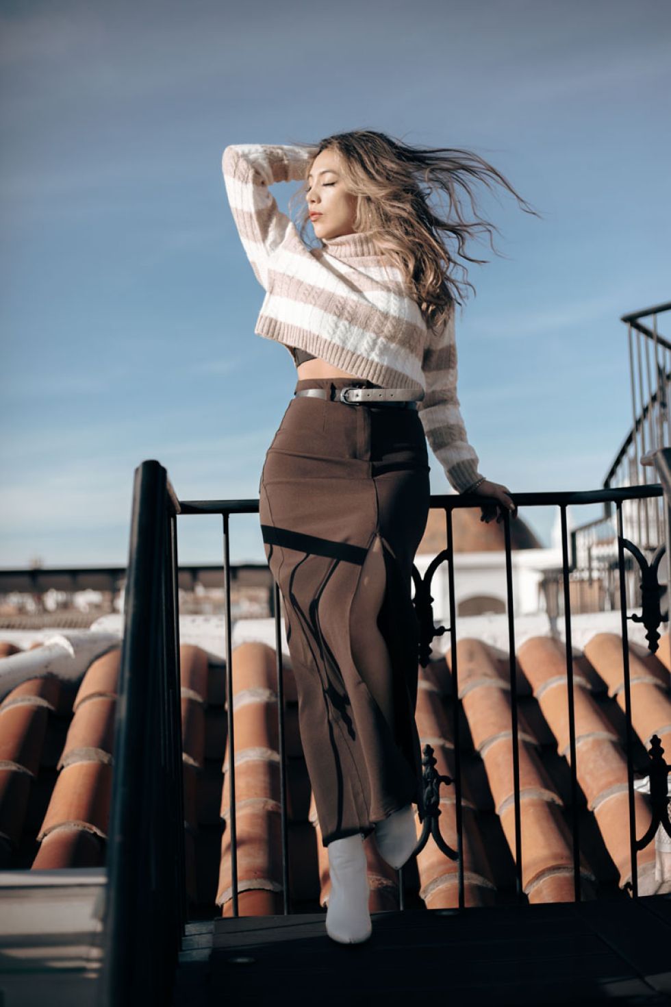 Y finalmente la propuesta a esthetic “old money” con un sweater con líneas y una falda midi acompañada con un cinto modesto para establecer los contrastes distintivos en un outfit con estilo •