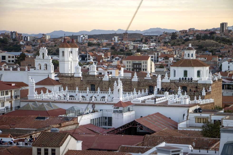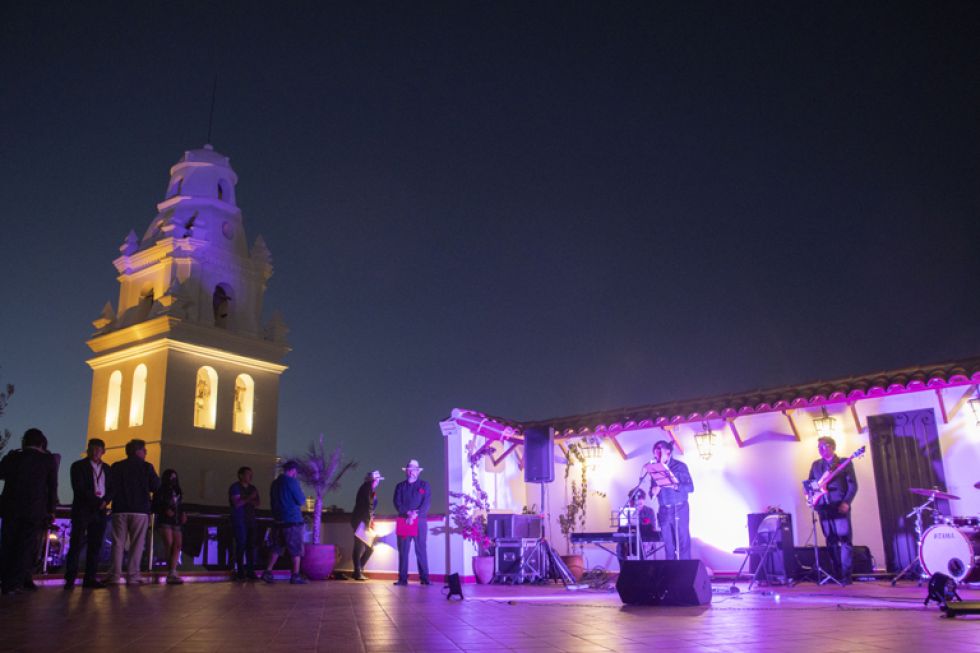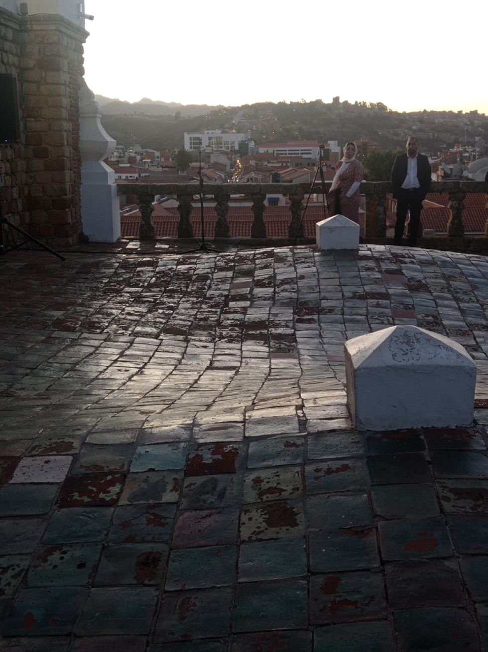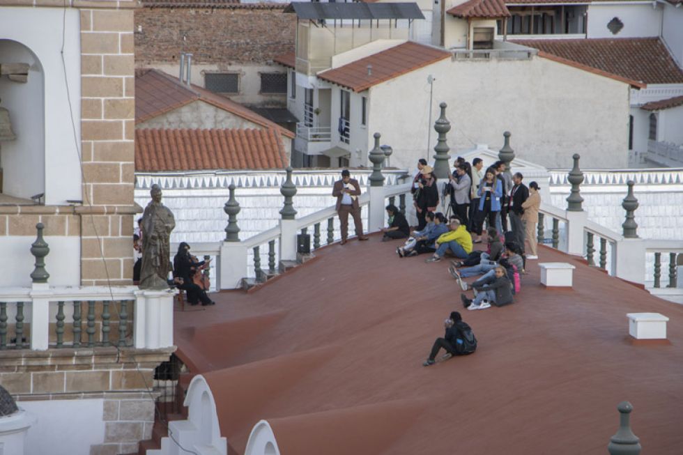 La actividad se tornó frenética en el centro de la ciudad de Sucre alrededor de la hora del té. Largas filas de personas esperaban pacientemente en la entrada de inmuebles patrimoniales para subir a los tejados, azoteas y terrazas, con el objetivo de ver el atardecer, escuchar música en vivo y apreciar demostraciones de danza. Este evento, llamado “Arte en los Tejados”, sirvió como antesala de la celebración del Bicentenario 2025.