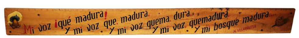Mi voz que, madura / y mi voz ¡Qué madura! / y mi voz que, madura / y mi voz quema, dura / y mi voz quemadura / y mi bosque madura