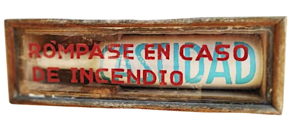 Rómpase en caso de Incendio y, tras el vidrio, hay un botellón