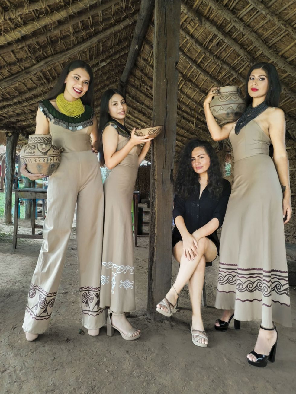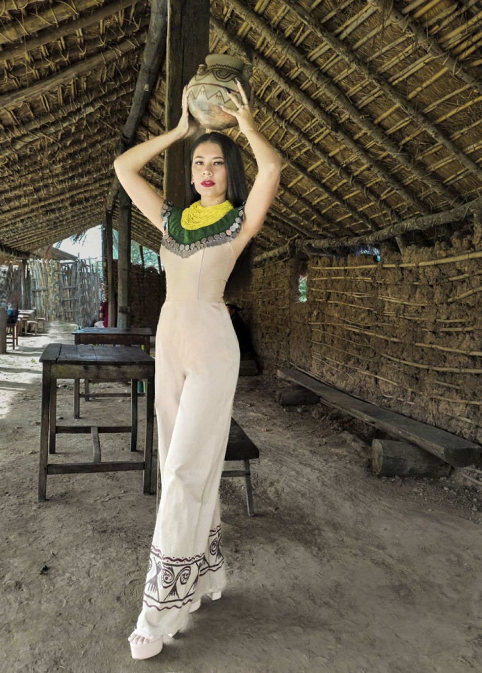 La propuesta de Cinthia Ríos incorpora diseños y estampados que evocan las técnicas ancestrales de la cerámica, transmitidas de madre a hija desde tiempos prehispánicos. Su colección se fundamenta en la riqueza de un patrimonio cultural vivo, transformando elementos artísticos tradicionales en piezas modernas que celebran la identidad y la resistencia del pueblo guaraní.