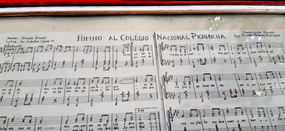 Por tanto, el periodo en el que tuvo que componerse y hasta estrenarse el Himno al Colegio Nacional de Pichincha tuvo que ser entre 1923 y 1927. Lo primero que a uno le tienta decir con ese dato es que debió estrenarse para el centenario del colegio, en 1926, y hasta el segundo párrafo parece confirmarlo: “Con fervor de honestos creyentes, / veneremos la Vieja Casona / que en cien años de vida blasona / ser el foco que irradia el saber”.
