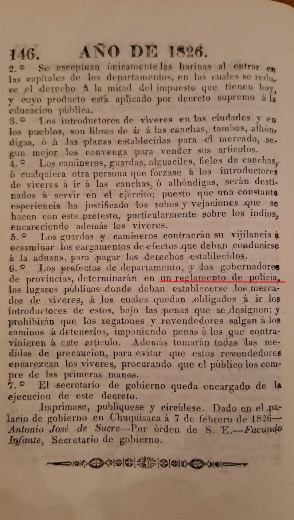 El artículo 6 de ese decreto decía que “los prefectos de departamento y los gobernadores de provincias determinarán en un reglamento de policía los lugares públicos donde deban establecerse los mercados de víveres, á los cuales quedan obligados á ir los introductores de éstos bajo las penas que se designen; y prohibirán que los regatones y revendedores salgan á los caminos á detenerlos, imponiendo penas á los que contravinieren á este artículo. Además, tomarán todas las medidas de precaución para evitar que estos revendedores encarezcan los víveres, procurando que el público los compre de las primeras manos”.