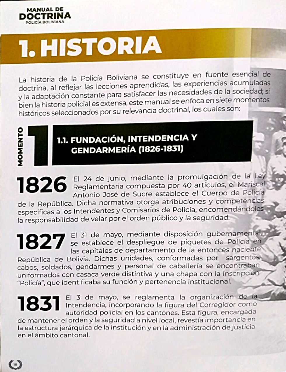 La Policía Boliviana fue fundada sobre la base del reglamento provisional de intendentes y comisarios promulgada el 1 de mayo de 1826 por el presidente Antonio José de Sucre y, aunque este y su ley reglamentaria del 24 de junio de ese año establecían en detalle cómo debían organizarse los cuerpos policiales del país, se admitió que esas normas podían tomar en cuenta las características regionales.