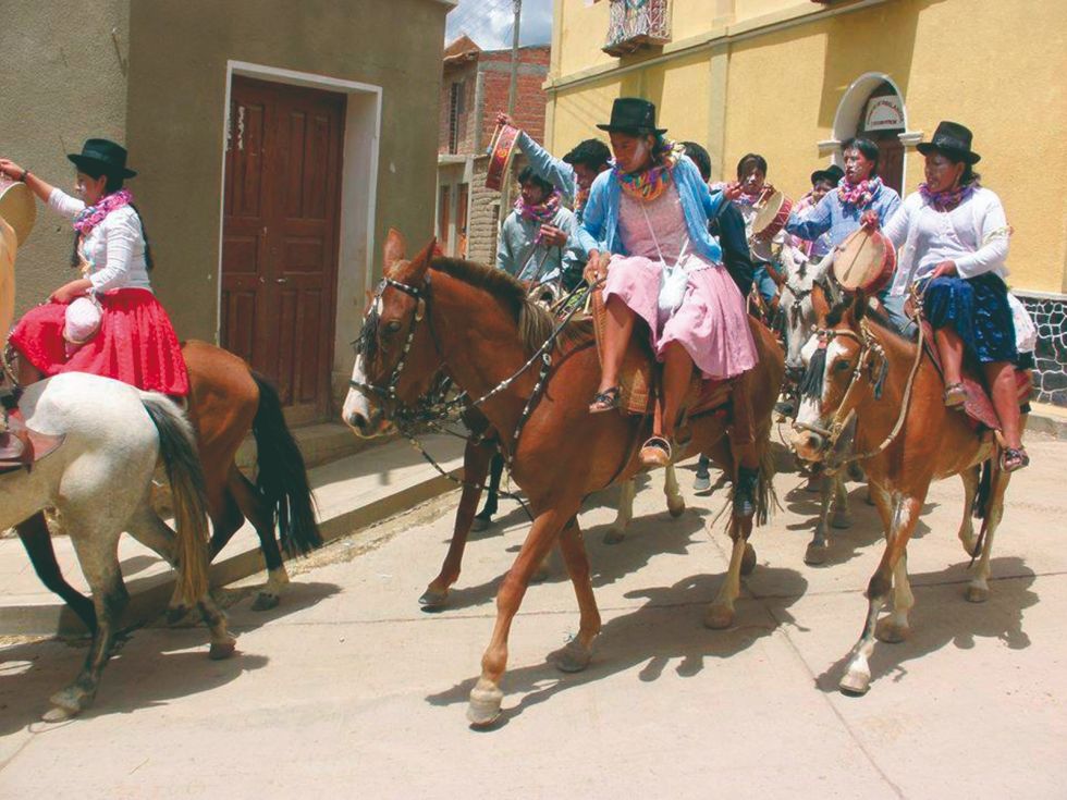 Lunes de Carnaval.- Alrededor de las diez de la mañana, las comparsas de los “paseadores” recorren las calles montados en caballos muy bien enjaezados, con monturas enchapadas de plata, adornadas con serpentinas y mixtura. Simpáticas cholitas lucen trajes coloridos como polleras plisadas, blusa blanca y un sombrero adornado con ramillo de flores y ramas de albahaca. Llevan consigo una bolsita de tela de seda que contiene confites, mixtura y frascos con talco.