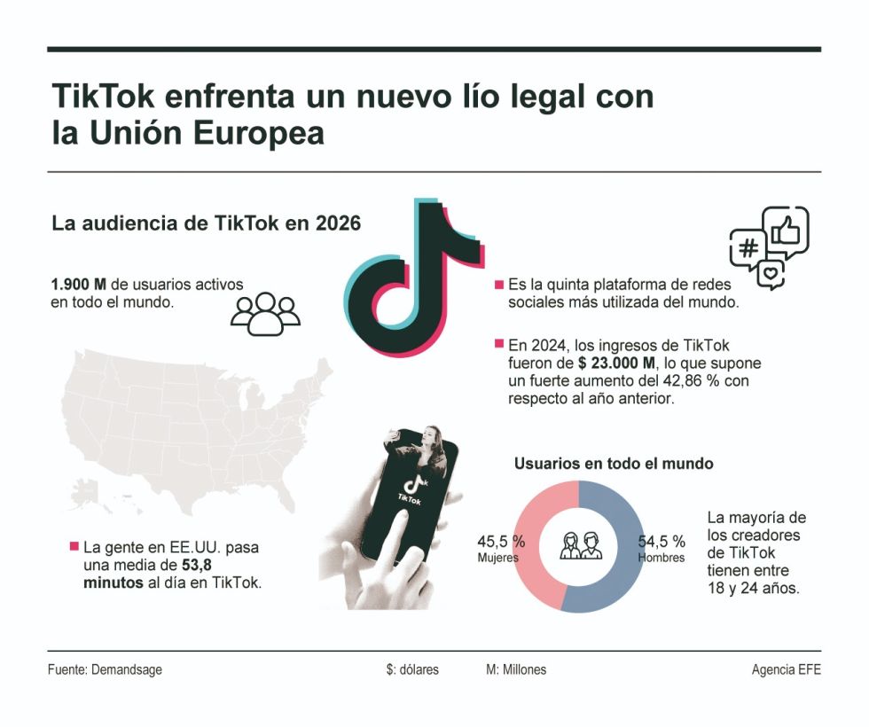 El Ejecutivo comunitario considera que TikTok está violando la ley de servicios digitales de la Unión Europea y le ha pedido que modifique el diseño de la plataforma. Si no lo hace o no está satisfecha con los cambios que proponga en el futuro, puede multarlo con hasta el 6% de su facturación anual a nivel global.