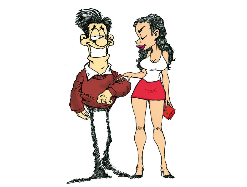 Al frente suyo tenía a un mujerón de 90-60-90 con unas piernas hasta el suelo, unas rodillitas rosaditas bien talladas, una cintura bien contorneada y las caderas que eran un contento contemplarlas, ni qué decir de ese rostro angelical bajado del cielo y sus cabellos azabache meneándose gracias a las caricias del viento. Al verla casi se desmaya y casi pierde la razón, mas fue su tenaz orgullo que lo mantuvo de pie, tragó saliva y ¡zaz! se compuso el asunto. Ambos se presentaron uno al otro y de ahí en adelante había que buscar un lugar ideal para hablar de números, estadísticas, billetes, porcentajes y dividendos.