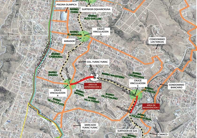 “La Subalcaldía del Distrito 3 está haciendo la apertura de un camino de tierra paralela a la avenida Juana Azurduy de Padilla hasta que se concluya este proyecto”, dijo Pardo, al señalar que esa vía comunicará entre la rotonda de ingreso al Condominio Bancario y la parada a Ravelo.