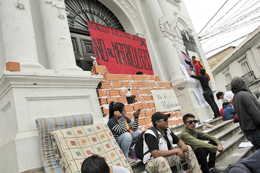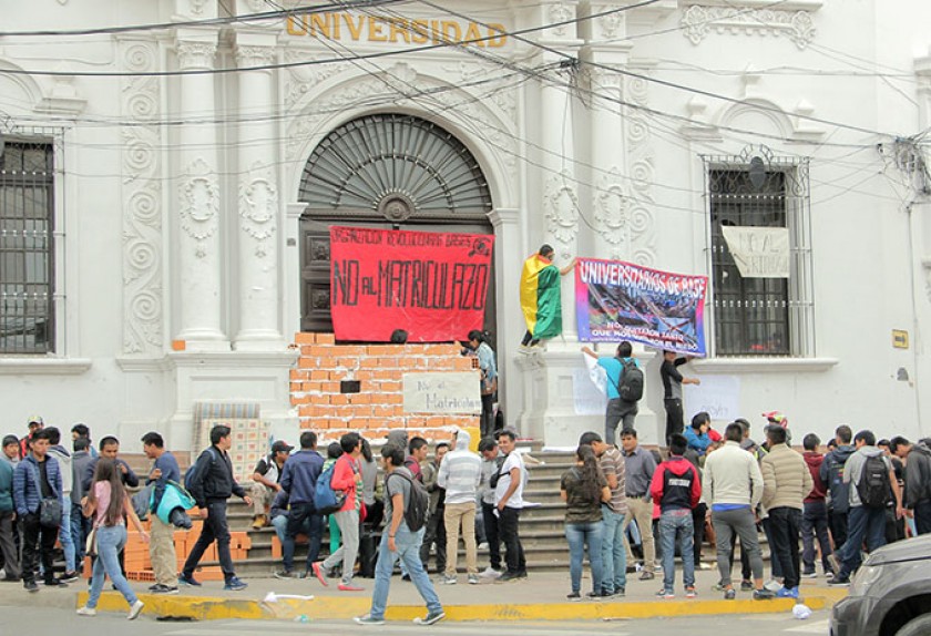 Un joven estudiante de la carrera de Sociología, proveniente de una provincia de Potosí y miembro de la Organización Revolucionaria Bases, asumió la extrema medida del tapiado en la puerta del edificio Central.