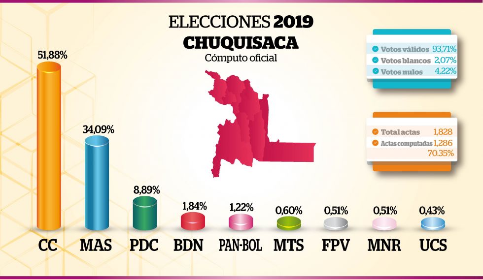 Según el portal web del Órgano Electoral Plurinacional (OEP), el TED logró computar 1.286 de las 1.828 actas de Chuquisaca, es decir, el 70,35%.