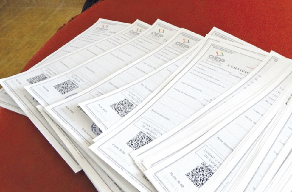 Entretanto, las 17 oficialías de Registro Civil en Sucre trabajan con cierta regularidad, emitiendo certificados de nacimiento, defunción y matrimonio. Este fin de semana, el Sereci entregó un pequeño lote de papel valorado que, según afirman los oficiales, durará hasta la próxima semana.