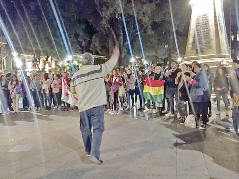 FE. Decenas de creyentes cristianos se congregaron anoche en la plaza 25 de Mayo para elevar oraciones. Foto: Mariana Calizaya Ante la exacerbación del conflicto que ya cobró tres vidas y cerca de un centenar de heridos en el país, la Iglesia católica y las congregaciones cristianas evangélicas de Sucre organizaron actividades para invocar a Dios por la pacificación.