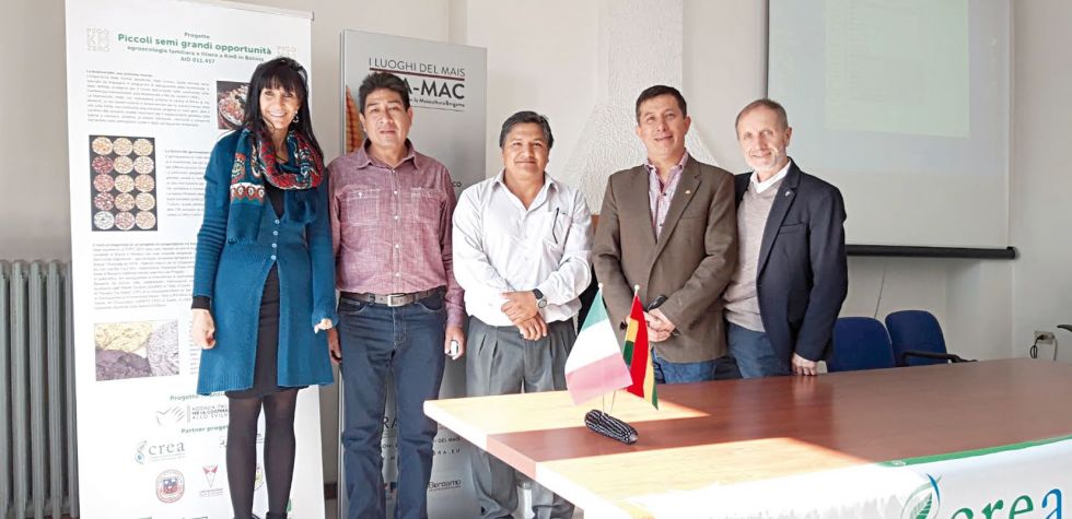 INVESTIGACIÓN: Juan Pablo Álvarez (segundo de la derecha), junto a los investigadores nacionales y extranjeros. Foto: GENTILEZA Una misión de profesores investigadores de tres universidades del país, entre ellas un representante de San Francisco Xavier de Chuquisaca, Juan Pablo Álvarez, se encuentra en Bérgamo (Italia) en cuyo Centro de Cereales y Cultivos Industriales (CREA-CI), uno de los más importantes del mundo en materia agrícola, se busca mejorar y valorizar maíces bolivianos relegados en su uso.