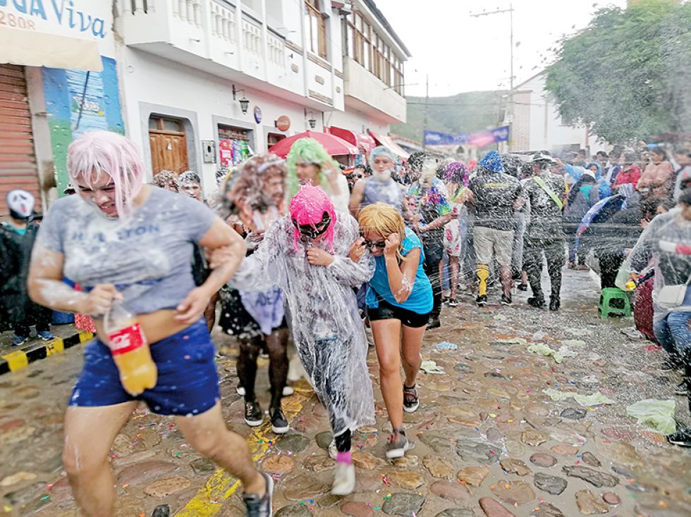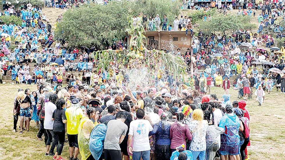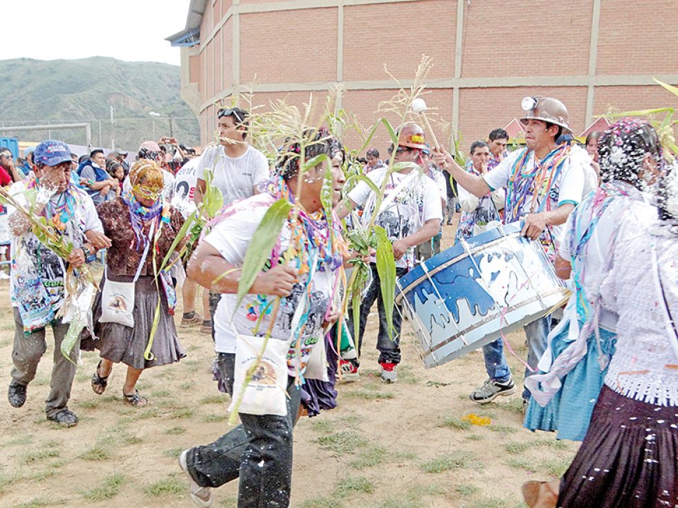 Coplas y enérgicos zapateos retumbaron en el campo deportivo de la Villa de Yotala durante la Entrada del Carnaval Grande que congregó a centenares de visitantes que disfrutaron de la algarabía en medio del intenso juego con agua y espuma que no eximió a nadie.