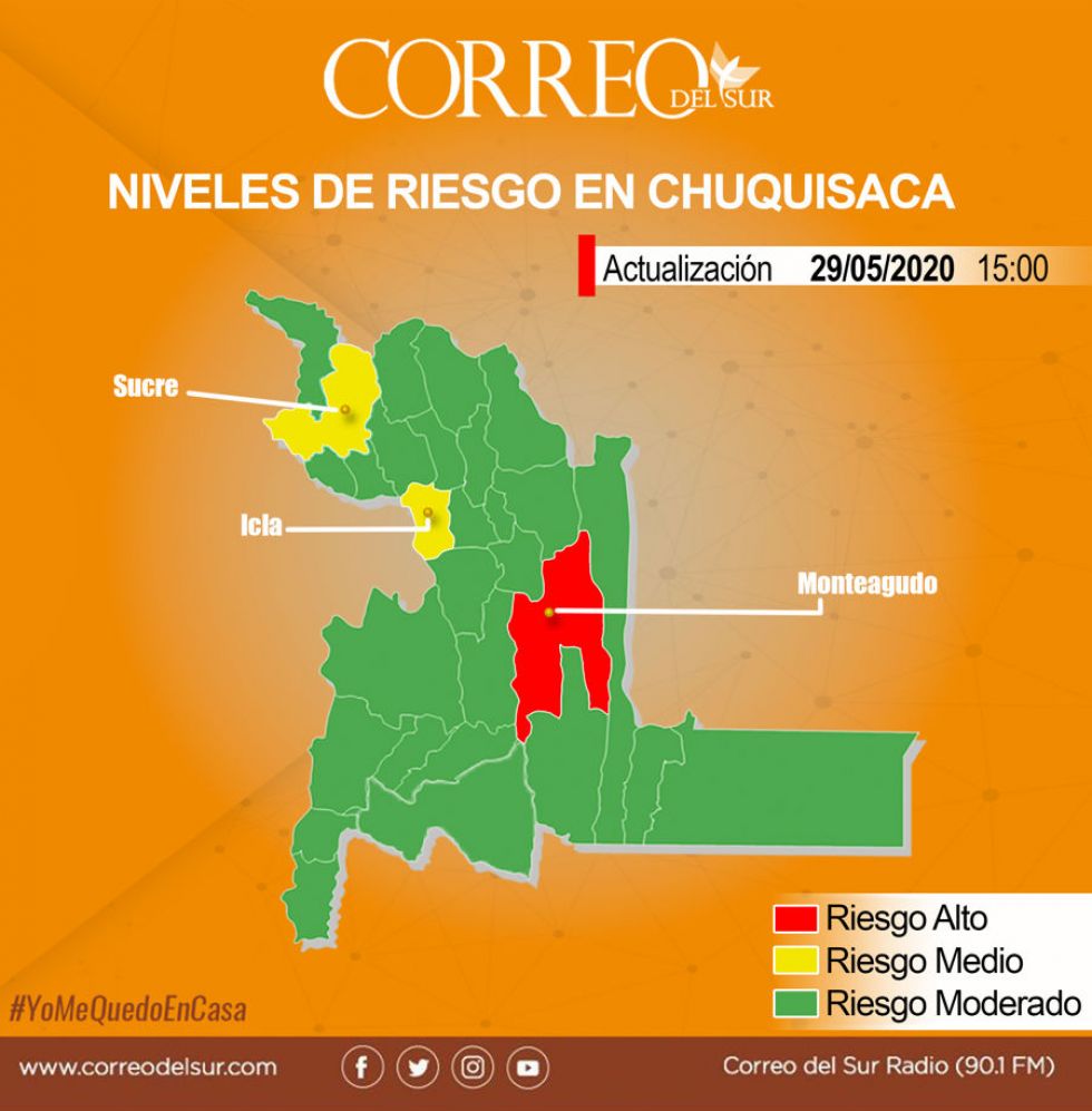 La nueva categorización reconfigura la situación de Chuquisaca, al elevar a Monteagudo (actualmente con cuatro casos positivos) de un nivel moderado –el más bajo– a riesgo alto –el más alto– y subir también la alerta en Icla al pasarlo de moderado a medio, pese a que se mantiene con solo 1 caso positivo, reportado el pasado 17 de mayo.