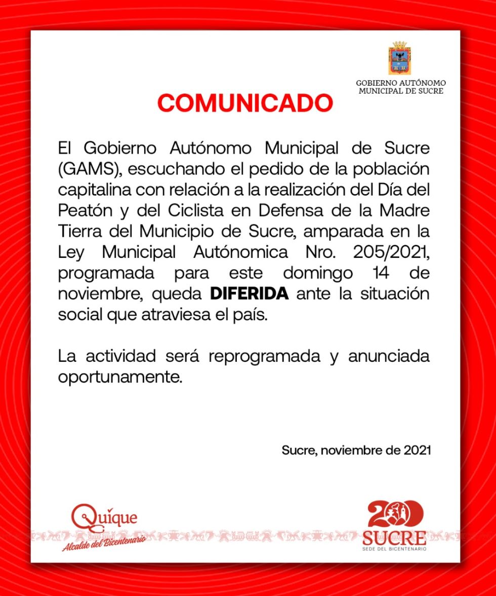 Informó su decisión la noche de este viernes, tras una nueva revisión. "Escuchando el pedido de la población capitalina con relación a la realización del Día del Peatón y del Ciclista en Defensa de la Madre Tierra del Municipio de Sucre, amparada en la Ley Municipal Autonómica N° 205/2021, programada para este domingo 14 de noviembre, queda diferida ante la situación social que atraviesa el país", reza el comunicado oficial.