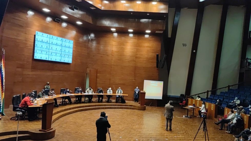 La reunión se desarrolla en el Centro Internacional de Convenciones. Foto: Gobernación de Chuquisaca Con más de una hora de retraso por el bloqueo en la zona de La Calancha, comenzó la reunión interinstitucional convocada por la Gobernación de Chuquisaca para definir el futuro del aeropuerto Juana Azurduy de Padilla, en el Centro Internacional de Convenciones y Cultura (CICC) de la zona de La Glorieta.