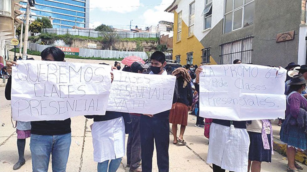 RECLAMO. Ayer, padres y estudiantes tomaron las oficinas de la Dirección Distrital de Sucre. Foto: Correo del Sur Padres de familia de la unidad educativa Gualberto Paredes Ferrufino, de la zona de Azari, y autoridades distritales de Sucre llegaron a un acuerdo, luego de que ayer se registrara una movilización y toma de las oficinas de la Dirección Distrital de Educación para exigir clases presenciales.