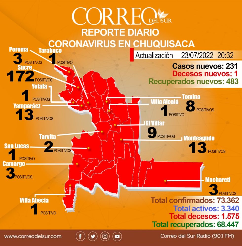 Coronavirus: 231 nuevos contagios este sábado en Chuquisaca y un fallecido