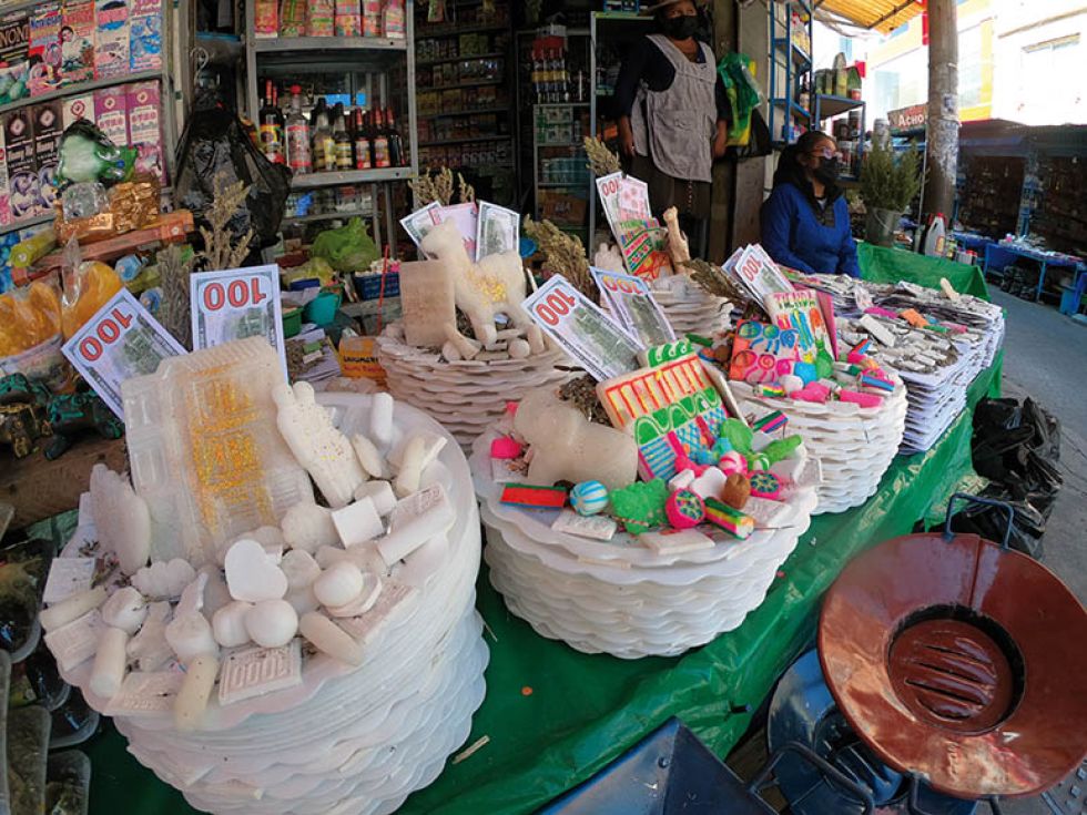 “Tenemos todo clase de q'oas, uno para casa, otro para amor en el hogar, para auto, negocio, dinero y también la mesa blanca para que el dinero no se vaya”, explica doña Flora, propietaria de uno de los puestos más famosos del lugar.
