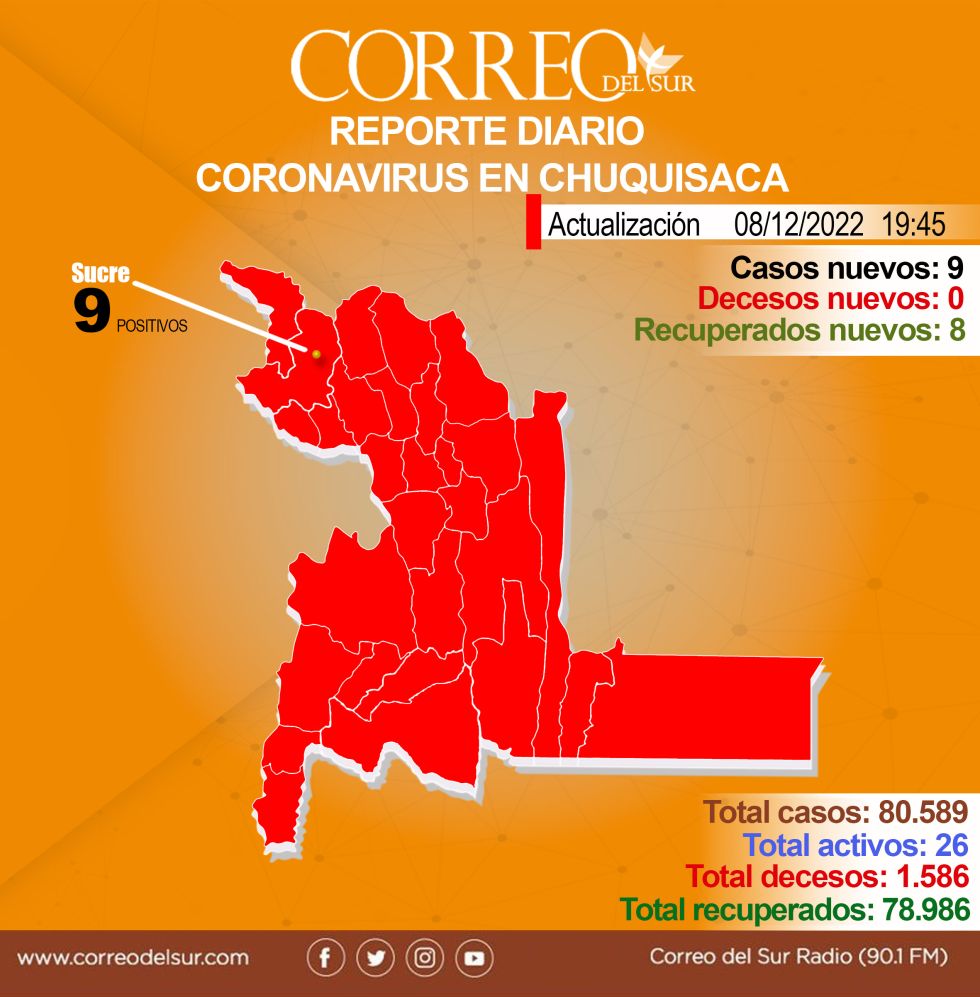 Luego de dos jornadas consecutivas con más de diez casos de covid-19, la cifra de contagios de Chuquisaca bajó este jueves. El Servicio Departamental de Salud notificó nueve pacientes con el virus.