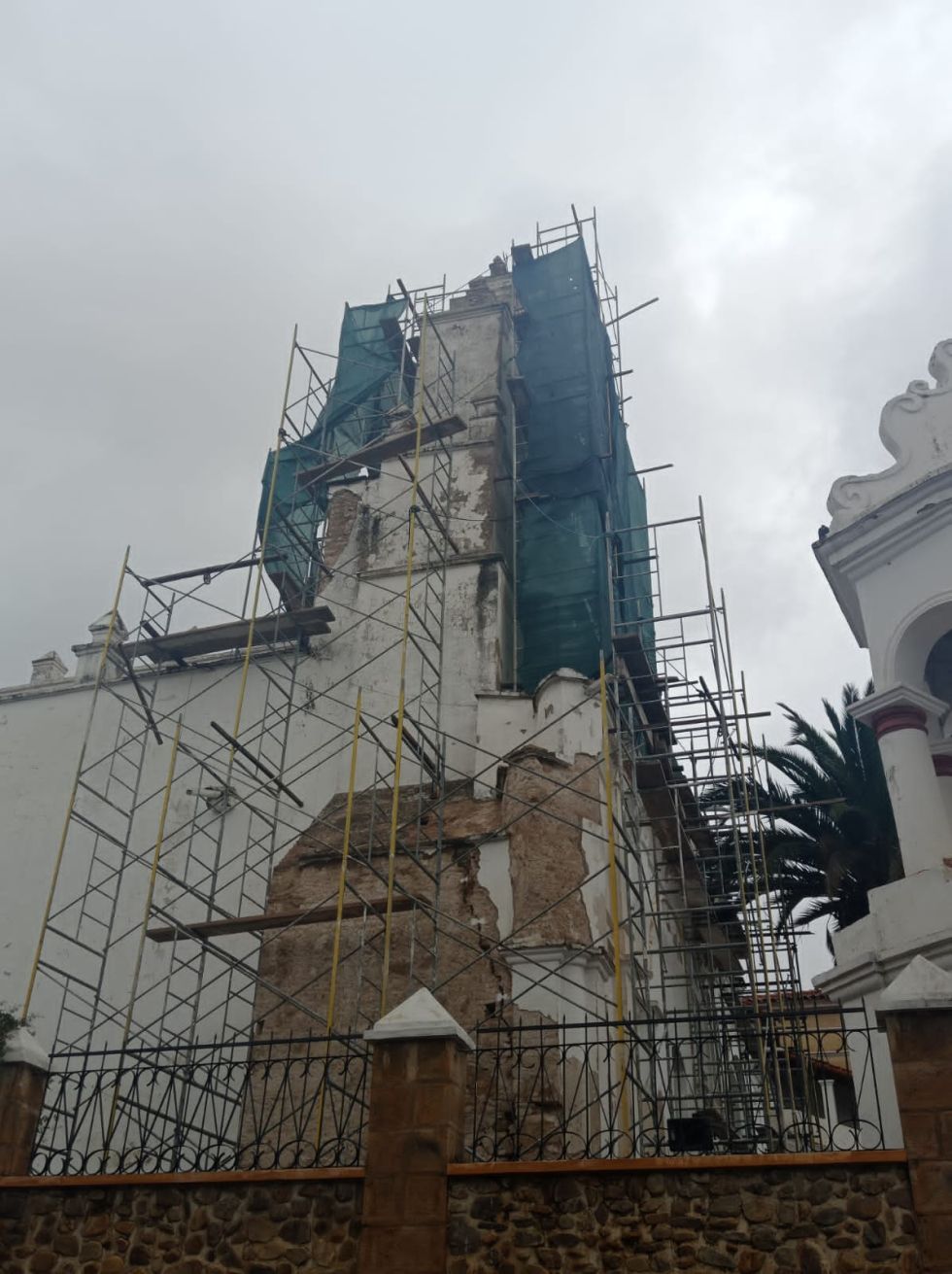 Aclaró que si bien la restauración solo contempla una de las fachadas, urge también intervenir la otra fachada, los techos y el atrio donde está la icónica torreta en la intersección de las calles Calvo y Bolívar de la ciudad de Sucre, razón por la cual la parroquia requieren conseguir el financiamiento para que la Escuela Taller Sucre permanezca in situ para trabajar en las otras fases y darle continuidad a los trabajos.
