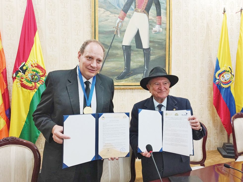 Durante el acto de firma, celebrado en la Sede Central del Órgano Académico de la Comunidad Andina, en Sucre, se impuso la Medalla de Docente de la Patria Grande “Simón Rodríguez” al MSc. Benjamín Juan Carlos Blanco Ferri, en reconocimiento a su destacada labor.