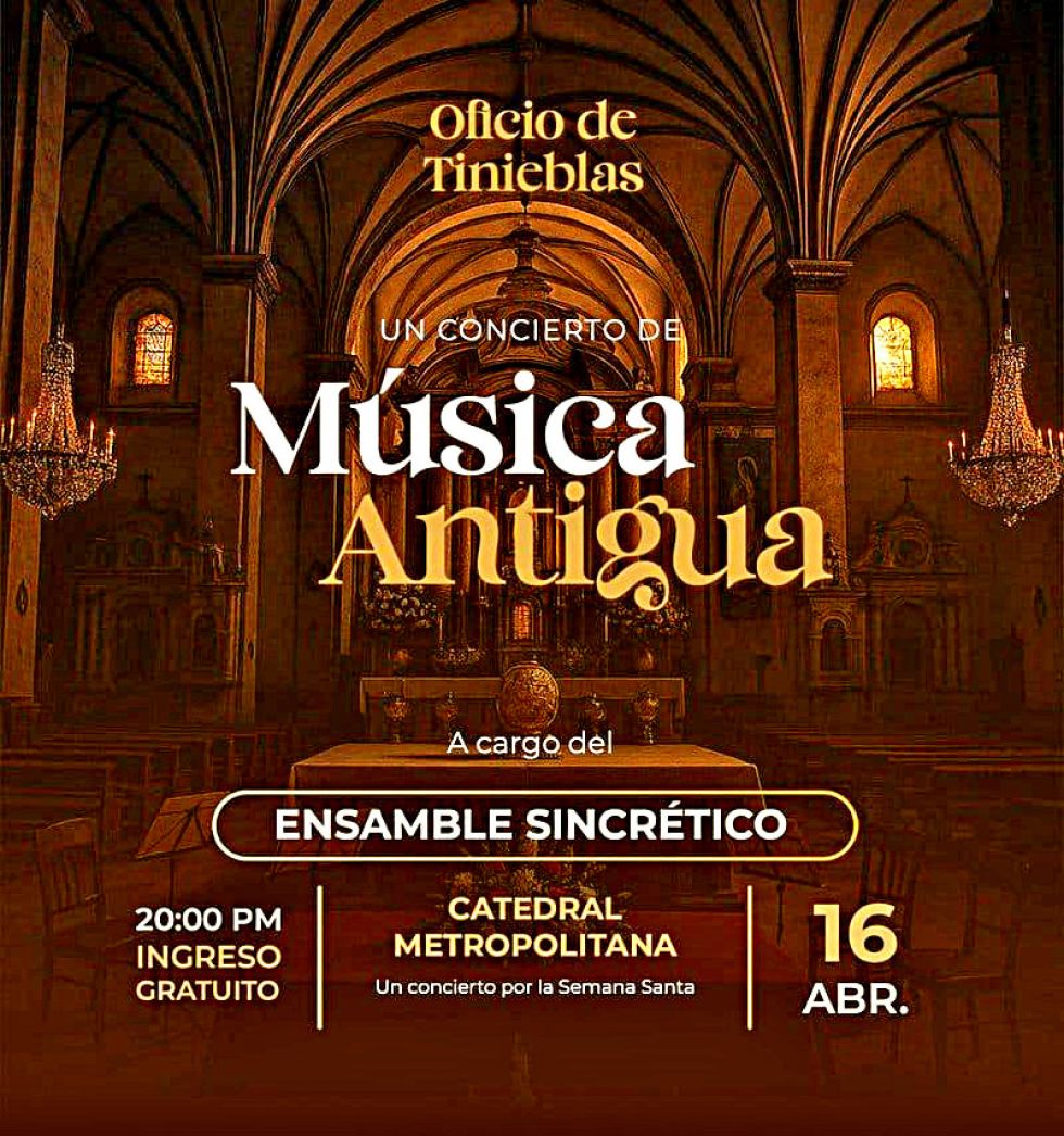 Para este miércoles, a las 19:30, se anuncia un concierto de música sacra a cargo de la Orquesta de Cuerdas y Coro Polifónico San Francisco Xavier en el Templo de Santa Ana. A las 20:00, el Ensamble Sincrético ofrecerá un concierto de música antigua “Vive el Oficio de Tinieblas”, en la Catedral Metropolitana, con entrada gratuita.
