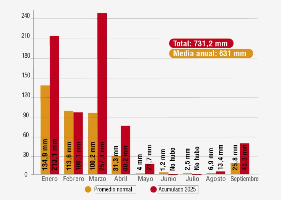 En los nueve meses de lo que va de este 2025, el acumulado de lluvias suma 731,2 mm, superando por un 15,8% (100,2 mm) el promedio anual (631 mm).