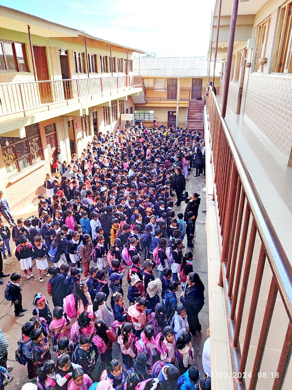 ESPACIO. De tope a tope, los estudiantes en el patio de la unidad educativa Thako Pampa. Foto: Gentileza En sol o en lluvia, más de 650 estudiantes forman o salen a su recreo en un patio de apenas 10 metros por 20, y pasan Educación Física fuera de la infraestructura, en un espacio de tierra. Esta triste realidad se vive a diario en la unidad educativa Thako Pampa, ubicada en el Distrito 3 de Sucre, a unos metros del Campo Ferial de Lajastambo.