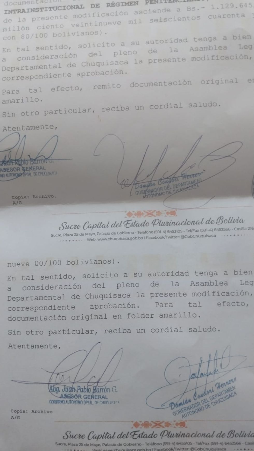 En conferencia de prensa, la mañana de este jueves, Garnica expuso documentación remitida desde la Gobernación, en la que —según afirmó— se evidencian rúbricas que no coinciden con la firma habitual de Condori. Por este motivo, solicitó a las instancias correspondientes realizar una investigación exhaustiva para verificar la legalidad de los documentos, considerando que con la firma del Gobernador “se disponen recursos económicos importantes para la población chuquisaqueña”.