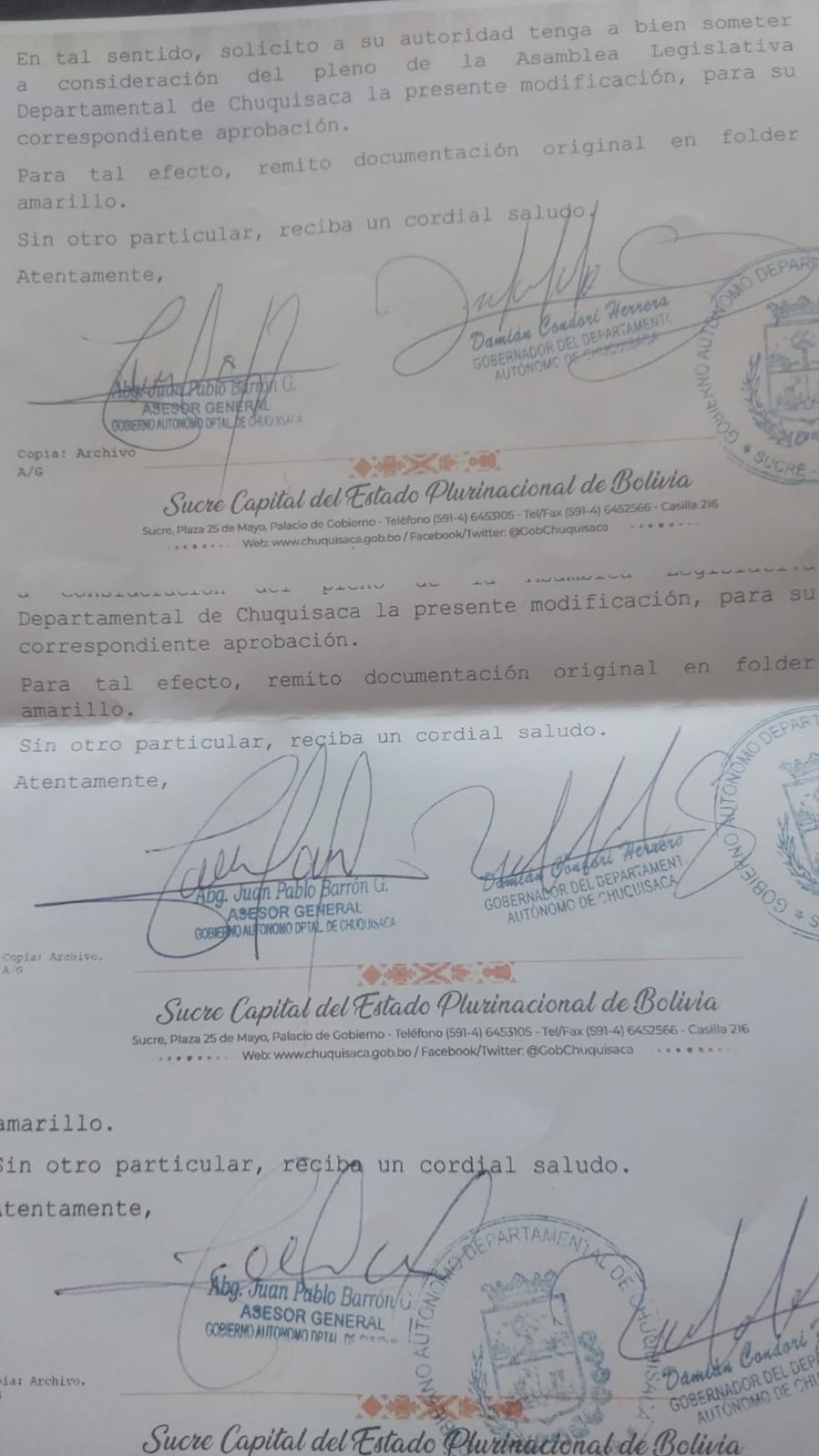 La Comisión de Planificación de la Asamblea Legislativa Departamental (ALD) de Chuquisaca, encabezada por su presidenta Silvia Garnica, expresó su preocupación por la crisis institucional que atraviesa el Órgano Ejecutivo departamental y anunció la presentación de una denuncia ante el Ministerio Público por presunta manipulación de documentos y de la firma del gobernador Damián Condori.