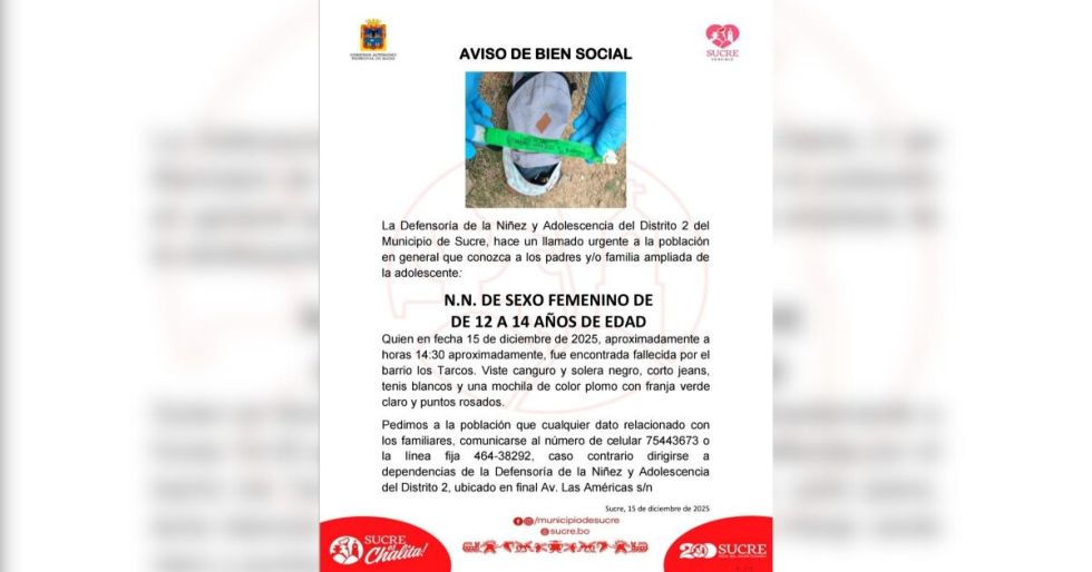 La Defensoría de la Niñez y Adolescencia del Distrito 2 del municipio de Sucre emitió un aviso de bien social para identificar a los familiares de una adolescente de sexo femenino, de entre 12 y 14 años de edad, que fue encontrada sin vida en el barrio Los Tarcos.