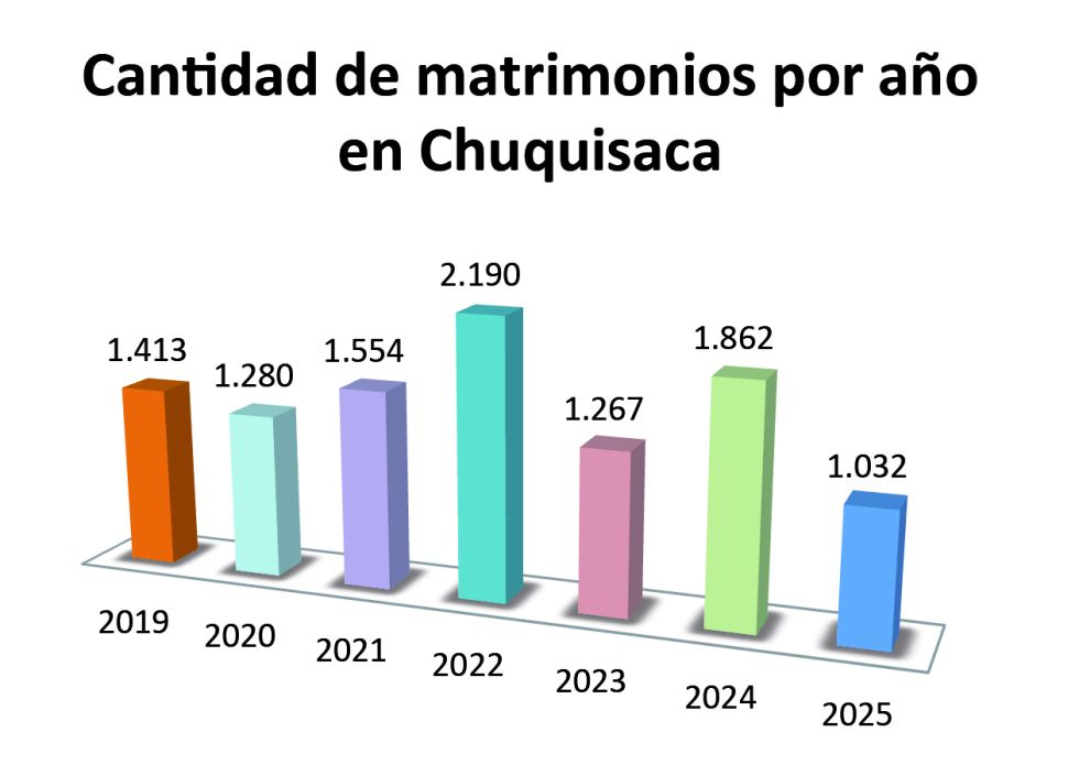 En ese sentido, a diferencia de los años impares, en el par casi siempre existe una mayor cantidad de matrimonios. Un claro ejemplo es que en el 2022 (par), en Chuquisaca se registraron 2.190 casamientos y al siguiente año (impar), esa cantidad bajó a 1.267. Algo similar ocurrió en los últimos dos años: el 2024 se tuvo 1.862 y el 2025, solo 1.032.