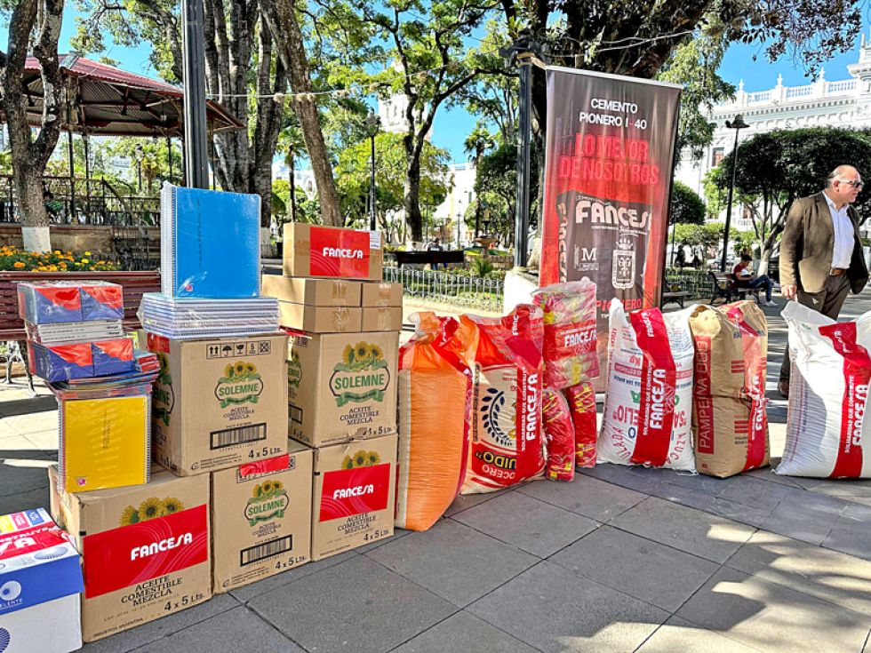 Este jueves, Fancesa entregó un stock de productos alimenticios, cemento y materiales escolares; mientras la Gobernación comprometió 200 mil bolivianos en alimentos, al margen de la campaña solidaria que encara desde hace unos días. La Alcaldía también continúa recolectando apoyo y prevé liberación de seguros.