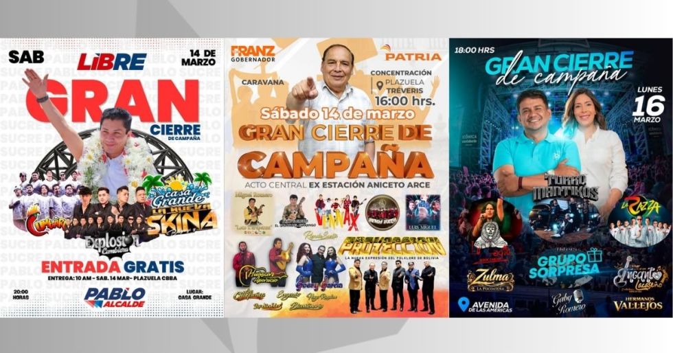Uno de los eventos se realizará este sábado con el cierre de campaña del candidato a la Alcaldía de Sucre, Pablo Arízaga, de la agrupación Libre. La actividad tendrá lugar en el local Casa Grande, ubicado en la calle Inca Garcilaso #135, donde se presentarán los grupos Explosión Cumbiera, La Nueva Skina y Cumbaros.