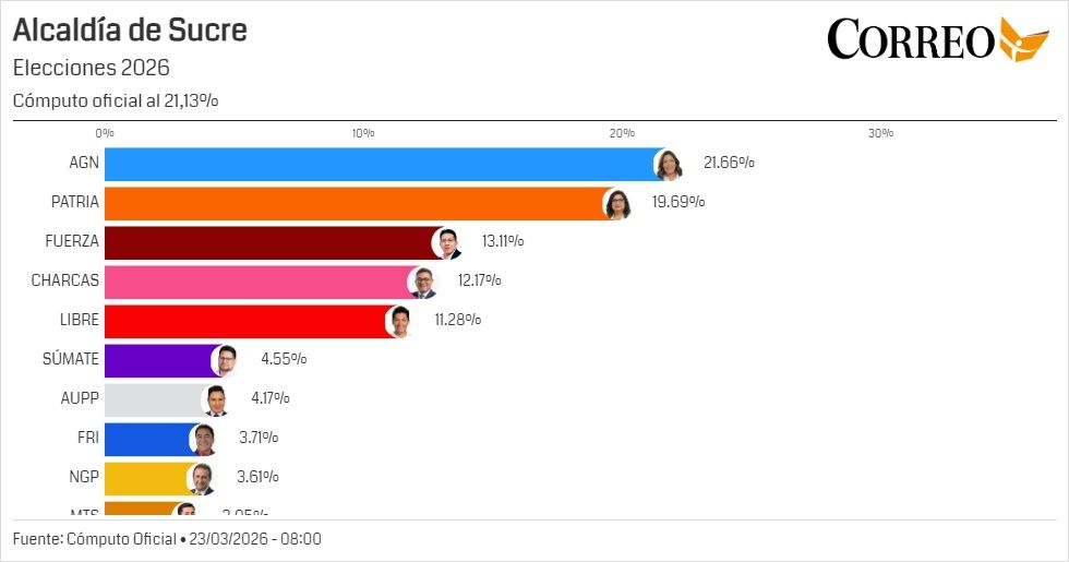 En el caso del municipio de Sucre, el escrutinio llegó al 21,13% (214 actas computadas) y refleja la misma tendencia de los resultados preliminares, con Fátima Tardío, de la Alianza Gente Nueva, y Teresa Dalenz, de Patria Unidos, liderando la votación.