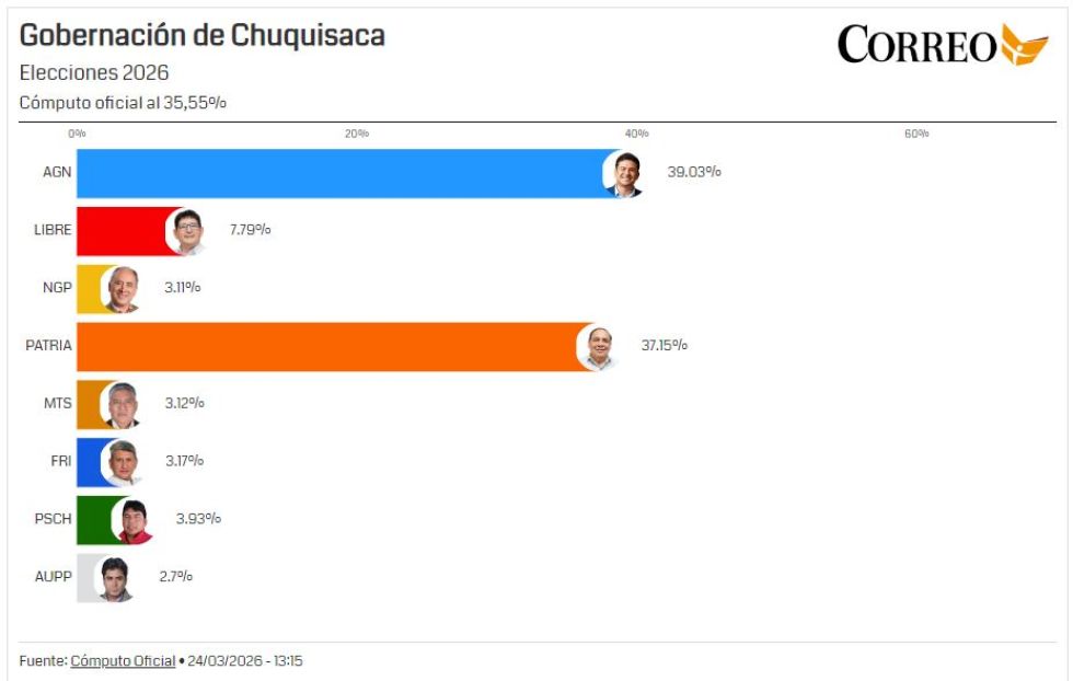 Al 35,55% de avance del cómputo de la votación por la Gobernación de Chuquisaca, Luis Ayllón, candidato de la Alianza Gente Nueva, se mantiene primero con el 39,03%, pero se redujo su diferencia a 1,88% con el segundo, Franz García, de la Alianza Patria Unidos (37,15%).