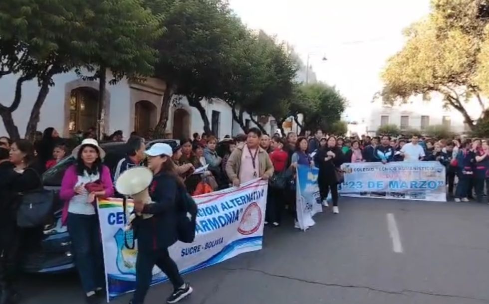 En una marcha de protesta de este miércoles, el magisterio urbano de Chuquisaca exigió al Gobierno un incremento salarial acorde al costo de vida y planteó una agenda de demandas que incluye la asignación de 100 horas para los niveles inicial, primario y educación alternativa, jubilación al 100%, entre otras.